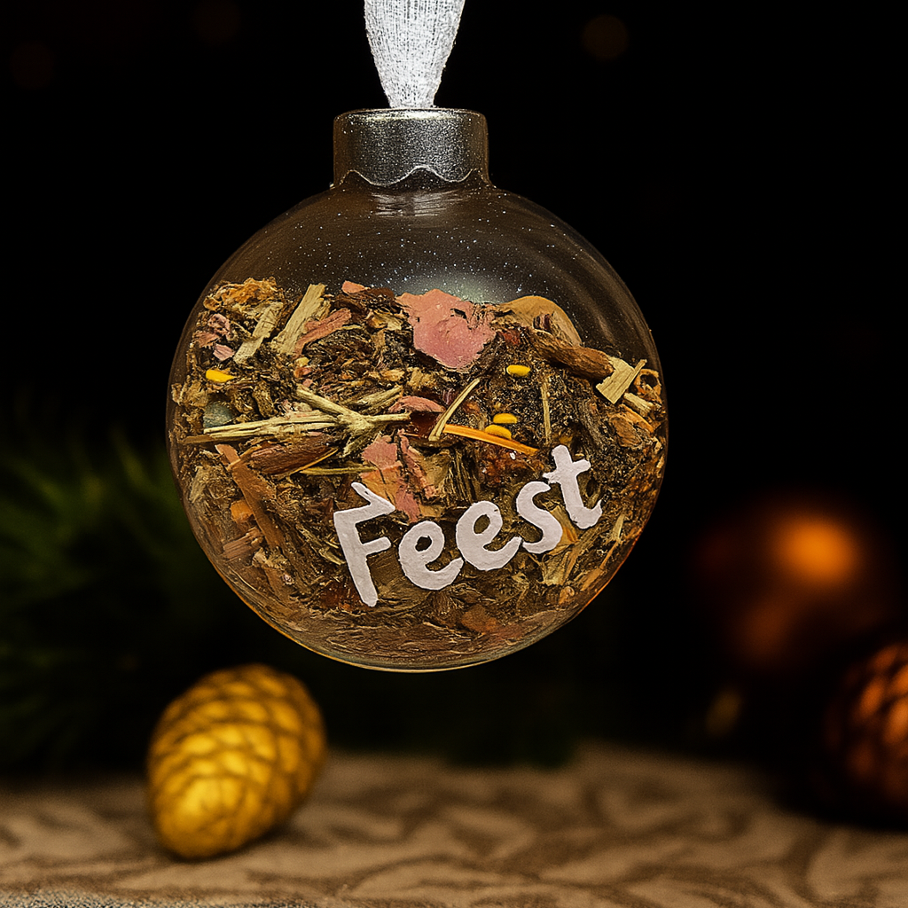 Een prachtige kerstbal van 10 cm doorsnede die wij voor jou gevuld hebben met de thee vieren.